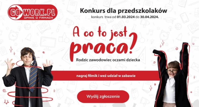 Jako firma odpowiedzialna społecznie, GoWork.pl nie stroni od organizowania konkursów o charakterze edukacyjnym czy społecznym, czego wyraz firma dała już w przeszłości. Teraz, wielkimi krokami zbliża się kolejne wydarzenie, w którym udział mogą wziąć dzieci w wieku przedszkolnym oczywiście przy wsparciu kochających rodziców. „A co to jest praca? Rodzic zawodowiec oczami dziecka" to konkurs, który trwa od 01.03.2024 do 30.04.2024.