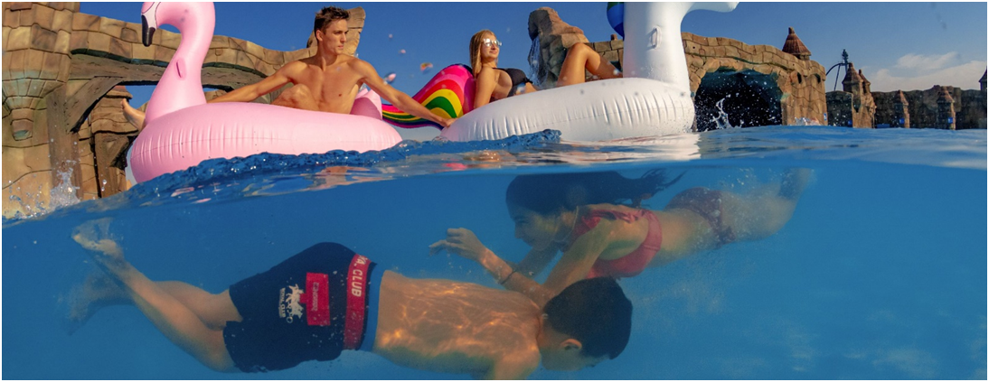 Ich łączna powierzchnia to aż 46500 m2, z czego prawie 5600m2 zajmują same baseny! Każda z części skrywa w sobie niesamowite atrakcje i zjeżdżalnie! Prawdziwą gratką dla fanów emocji będzie niewątpliwie Tropical Fun, w którym oprócz pontonów odnaleźć można najbardziej ekstremalne zjeżdżalnie, jak na przykład RMF MAXXX Kamikadze czy Tiki Ride o wysokości aż 15,5 metra! W tej części Parku zabawę odnajdą również mniej wymagający Goście, którym wyzwanie postawi Aloha Slide lub Rzeka Adventure River, którą zakończyć można emocjonalnym zjazdem na zjeżdżalni, bądź relaksującym spływem! Każdy znajdzie tutaj coś dla siebie, gdyż samych zjeżdżalni jest aż 12, a powierzchnia tej części wynosi aż 1,94 hektara! Wodni entuzjaści muszą również wstąpić do jednego z trzech basenów znajdujących się w Big Milk Water Park, wybierając dla siebie odpowiednią ich głębokość! Ze spokojem można wstąpić tu również z dzieckiem, gdyż głębokość basenów zaczyna się już od 20 cm. Kolejnym, obowiązkowym do odwiedzenia miejscem jest prawdziwie egzotyczna wyspa o powierzchni prawie 2 hektarów! Exotic Island otwarty w 2021 roku może pochwalić się aż dwoma basenami o łącznej powierzchni 3790 m2! Towarzyszy im iście tropikalny plac zabaw, w którego skład wchodzą armatki wodne, koła młyńskie i inne tryskające wodą atrakcje! Również w tej strefie ze spokojem można pobawić się z maluchami, w których znaleźć można liczne atrakcje, niewielkie zjeżdżalnie i kolorowe tryskające wodą zabawki odpowiednie dla najmłodszych! Strefa ta jest idealnym przystankiem w zabawie, gdyż odnajdziecie tu, oprócz wodnego szaleństwa, punkty gastronomiczne wspomagające dalszą zabawę! Ostatnim, koniecznym do odwiedzenia miejscem będzie Bamboo Bay, najnowsza część Parku Wodnego, która premierę swoją będzie miała w roku 2022 i wzbogaci Park o kolejne 16 zjeżdżalni!