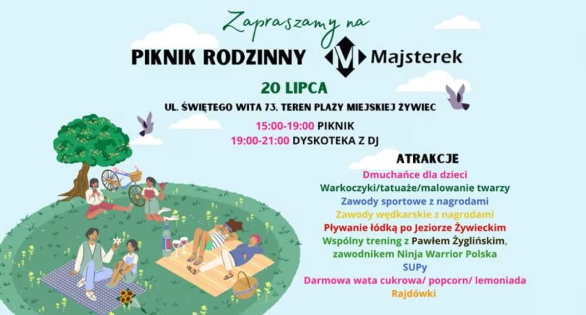 W sobotę 20 lipca na Plaży Miejskiej w Żywcu odbędzie się długo oczekiwany Piknik Rodzinny organizowany przez firmę Majsterek oraz Miasto Żywiec. Wydarzenie rozpocznie się o godz. 15.00, oferując szeroką gamę atrakcji dla całej rodziny.