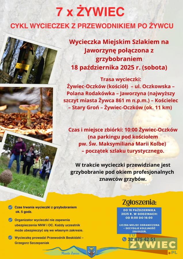 Zapraszamy na wędrówkę z cyklu „7 x Żywiec” po Jaworzynie, organizowaną przez miasto Żywiec 18 października 2025 r. Trasa liczy 11 km, prowadząc przez malownicze tereny beskidzkie. Po drodze uczestnicy zbierają grzyby pod okiem ekspertów. Wyruszamy o godz. 10:00 z parkingu przy kościele w Żywcu-Oczkowie. To doskonała okazja do połączenia rekreacji, nauki i relaksu w naturalnym środowisku. Zajęcia poprowadzi Przewodnik Beskidzki Grzegorz Szczepaniak. Liczba miejsc ograniczona, dlatego zgłoszenia przyjmowane są do 16 października 2025 r. Zainteresowanych zapraszamy!