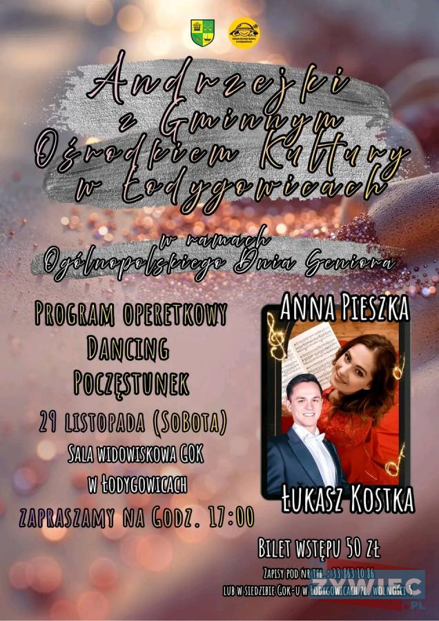 Zapraszamy do obejrzenia galerii zdjęć z przedstawienia z okazji Ogólnopolskiego Dnia Seniora zorganizowanego przez Gminny Ośrodek Kultury w Łodygowicach. Wydarzenie, które odbyło się 29 listopada, łączyło muzykę, taniec i integrację w serdecznej atmosferze. Uczestnicy mogli cieszyć się koncertem operetkowym Anny Pieszki i Łukasza Kostki, a także wziąć udział w wspólnym tańcu przy dobrej muzyce. Na spotkaniu nie zabrakło również pysznego poczęstunku. To był wyjątkowy sposób uczczenia Dnia Seniora i spędzenia czasu w miłym towarzystwie.