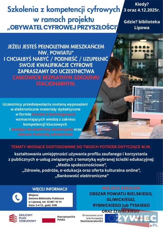 Zapraszamy na DARMOWE WARSZTATY CYFROWE DLA DOROSŁYCH organizowane przez Gminną Bibliotekę Publiczną w Lipowej. Warsztaty odbędą się 3-4 GRUDNIA 2025 r. w godzinach 9:00-15:00. Szansę rozwinięcia umiejętności cyfrowych mają osoby dorosłe (18 ). Na zajęciach nauczysz się m.in. korzystania z e-usług publicznych, bezpiecznego poruszania się w sieci, komunikacji online i analizy informacji w internecie. Liczba miejsc ograniczona - decyduje kolejność zgłoszeń. Zapisy i więcej informacji pod numerem 33 867 16 74 lub mailowo: [email protected]. Nie zwlekaj!