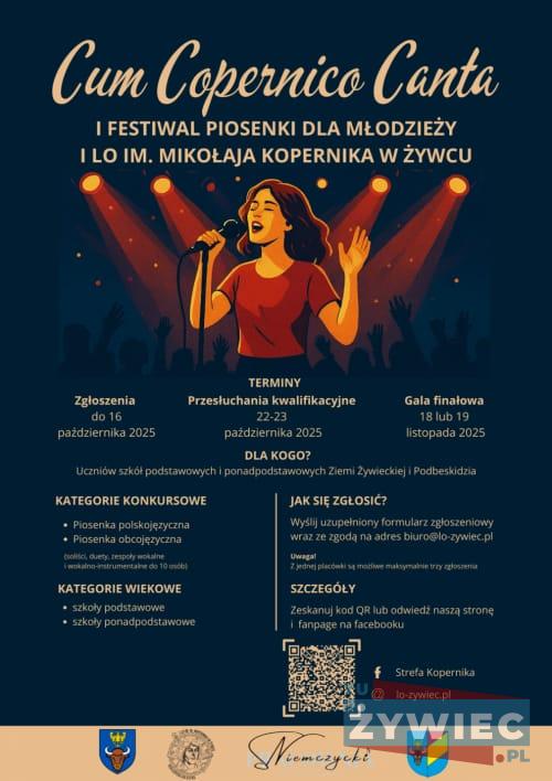 Zapraszamy serdecznie do obejrzenia galerii zdjęć z pierwszej edycji Festiwalu Piosenki dla Młodzieży „Cum Copernico Cantar” organizowanego przez I LO im. Mikołaja Kopernika w Żywcu. Wydarzenie to przyciągnęło utalentowanych uczestników z Ziemi Żywieckiej i Podbeskidzia. Przesłuchania kwalifikacyjne miały miejsce 22-23 października 2025 roku, a Gala Finałowa odbyła się 18 lub 19 listopada 2025 roku. Konkurs obejmował dwie kategorie językowe: piosenkę polskojęzyczną i obcojęzyczną, a uczestnicy mieli szansę wystąpić solo lub w grupach. Na zwycięzców czekały atrakcyjne nagrody pieniężne i rzeczowe, takie jak Grand Prix i miejsca w drugiej kategorii. Organizatorzy zachęcali zarówno początkujących, jak i doświadczonych artystów do wzięcia udziału, co sprawiło, że festiwal stał się doskonałą okazją do muzykowania, rywalizacji i dobrej zabawy.
