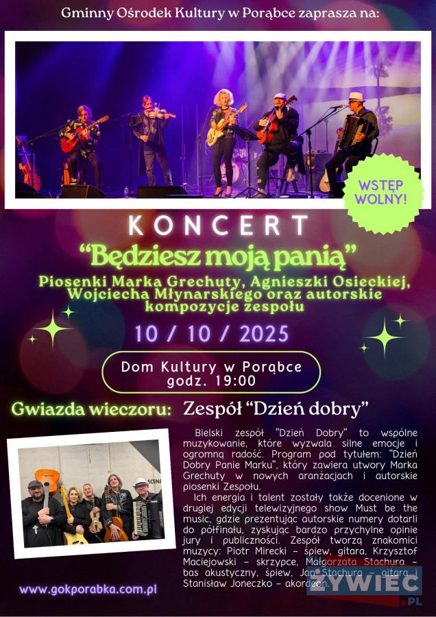 Koncert pt. „Będziesz moją panią” w Porąbce zapowiada się jako niepowtarzalne wydarzenie muzyczne. Podczas wieczoru, pełnego utworów Marka Grechuty, Agnieszki Osieckiej i Wojciecha Młynarskiego, zespół Dzień Dobry zaserwuje także swoje autorskie kompozycje. Energetyczne występy, słodki poczęstunek i integracyjna atmosfera sprawią, że każdy będzie mógł cieszyć się wyjątkową muzyką oraz spędzić czas wraz z lokalną społecznością. Zapraszamy serdecznie wszystkich miłośników polskiej poezji śpiewanej do Domu Kultury w Piątek!