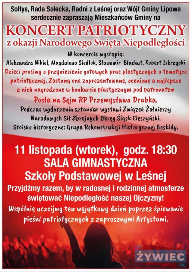 Zapraszamy na Koncert Patriotyczny z okazji Narodowego Święta Niepodległości, który odbędzie się w Leśnej. Wydarzenie, organizowane przez lokalne władze i artystów, ma na celu świętowanie niepodległości Polski poprzez pieśni patriotyczne. Dla dzieci przewidziano konkurs plastyczny, a dla wszystkich stoisko historyczne i wiele innych atrakcji. Weź udział razem z nami w tej wyjątkowej uroczystości!