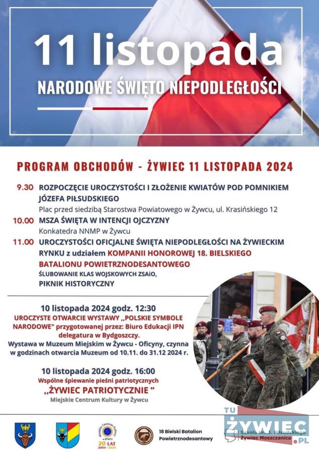 Galeria zdjęć z uroczystości z okazji Narodowego Święta Niepodległości w Żywcu. Kwiaty pod pomnikiem Józefa Piłsudskiego, msza w Konkatedrze, Kompania Honorowa 18. Bielskiego Batalionu Powietrznodesantowego na żywieckim Rynku, piknik historyczny i śpiewanie pieśni patriotycznych - wszystko to podczas obchodów 106. rocznicy odzyskania niepodległości. Moment hołdu bohaterom i wzmacniania ducha patriotycznego.