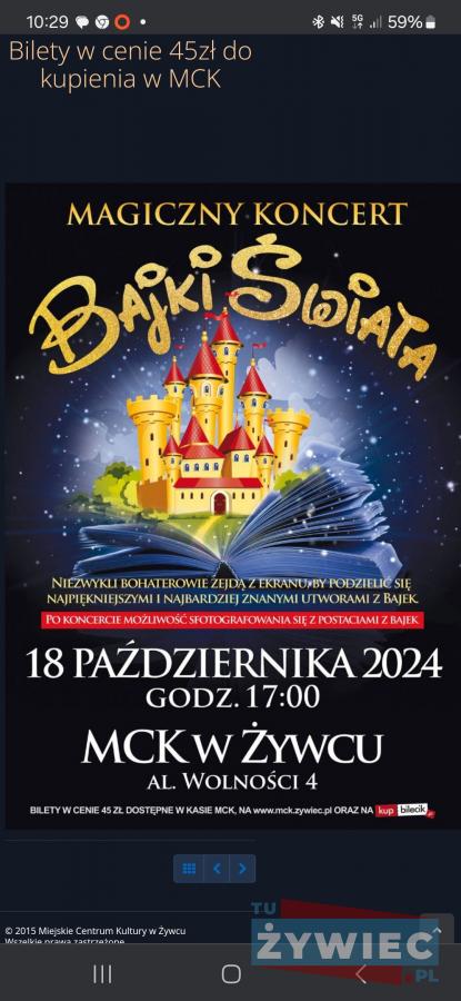 Zapraszamy na Magiczny Koncert Bajki Świata! Przenieśmy się do Stumilowego Lasu z Kubusiem Puchatkiem, a potem popłyniemy z Vaianą po południowym Pacyfiku. Zobaczymy Małą Syrenkę w morskich głębinach i wylądujemy z Tarzanem na Sawannie z Królem Lwem. Widowisko pełne kolorów, muzyki i radości dla dzieci i młodzieży. Bądźcie z nami 18 października 2024 o 17:00 w MCK w Żywcu! Bilety dostępne online i w kasie.