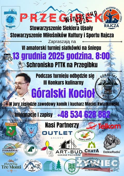 Zapraszamy na Przegibek Winter Cup 2025 - sportowo-kulinarną ucztę na Beskidzie Żywieckim! Siatkówka na śniegu to nie tylko gratka dla zawodników, ale i emocje dla kibiców. VI turniej siatkówki oraz III edycja konkursu kulinarnego „Góralski Kocioł” sprawią, że 13 grudnia 2025 r. Schronisko PTTK na Przegibku stanie się miejscem niezapomnianych zmagań. Doświadczona działacze oraz gość specjalny - Maciej Kwiatkowski, zapewnią profesjonalną ocenę dań i dawkę dobrej zabawy. Zgłoszenia od przybyłych kulinarnych talentów i siatkarskich drużyn przyjmowane są pod dedykowanym numerem. Przegibek Winter Cup 2025 - warto być!