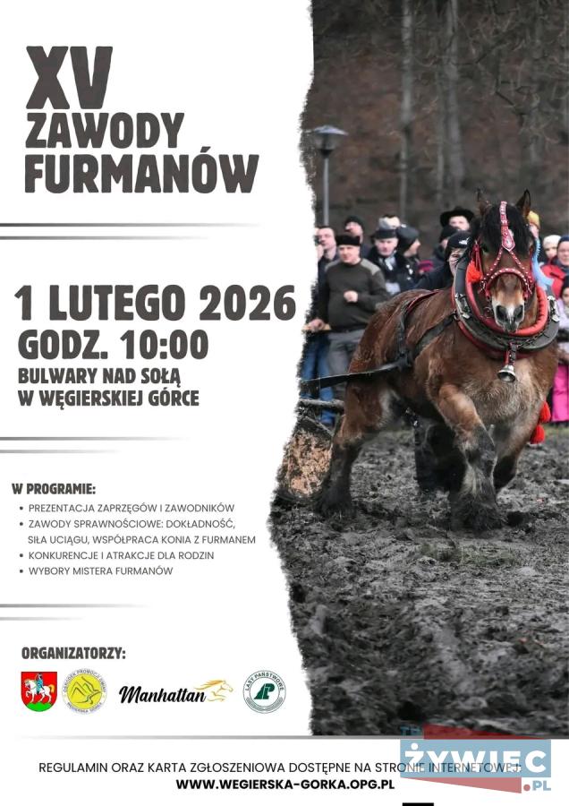 Zapraszamy do galerii zdjęć z XV Zawodów Furmanów, które odbędą się w Węgierskiej Górce już w najbliższą niedzielę. Impreza to hołd dla pracy człowieka i konia w Beskidzie Żywieckim. Tradycja spotyka siłę, a doświadczenie - precyzję. Zawody nie tylko to sport, ale także historia i zaufanie. Konie pociągowe i umiejętności furmanów będą gwiazdami dnia. Wydarzenie kierowane jest do całych rodzin, zapewniając emocje i wiele atrakcji. Przybądź i celebrować góralską tradycję razem z nami!