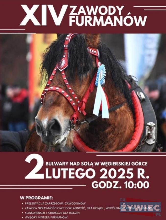 Zapraszamy na XIV edycję Zawodów Furmanów w Węgierskiej Górce! Wydarzenie na Bulwarach nad Sołą odbędzie się 2 lutego 2025 r. Podziwiaj zaprzęgi, rywalizuj w zawodach sprawnościowych i baw się z rodziną. Odkryj tradycję i kunszt pracy z końmi!