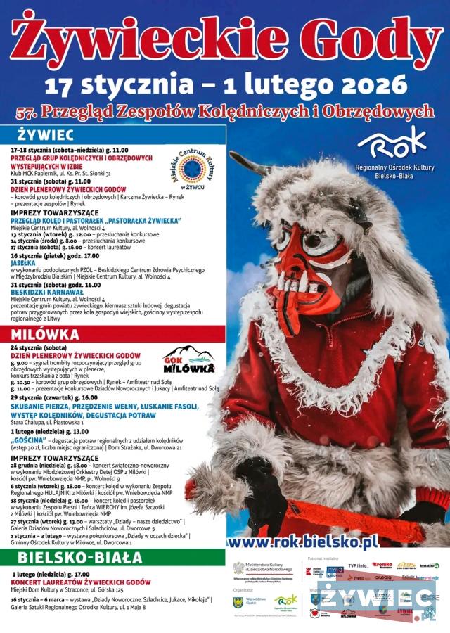 Przegląd Zespołów Kolędniczych i Obrzędowych – Żywieckie Gody to tradycyjne święto kultury regionu, które od lat przyciąga miłośników folkloru. Podczas 57. edycji od 17 stycznia do 1 lutego 2026 roku w Żywcu, Milówce i Bielsku-Białej odbędą się liczne wydarzenia, takie jak korowody, konkursy oraz występy grup kolędniczych. To doskonała okazja do poznania wielowiekowych zwyczajów związanych z okresem noworocznym i uczestnictwa w kulturalnych atrakcjach. Nie przegap koncertu laureatów i wystaw tematycznych!